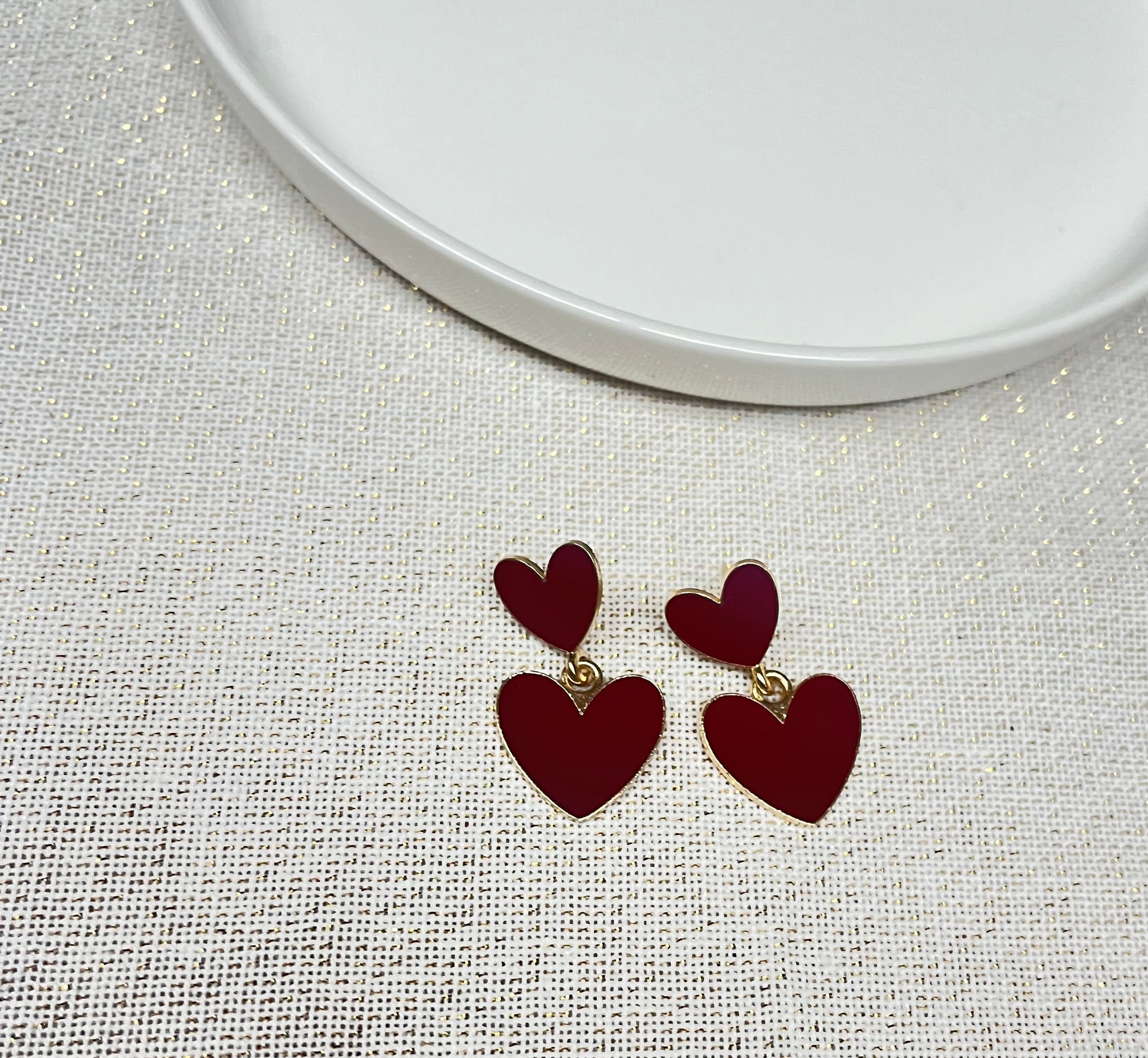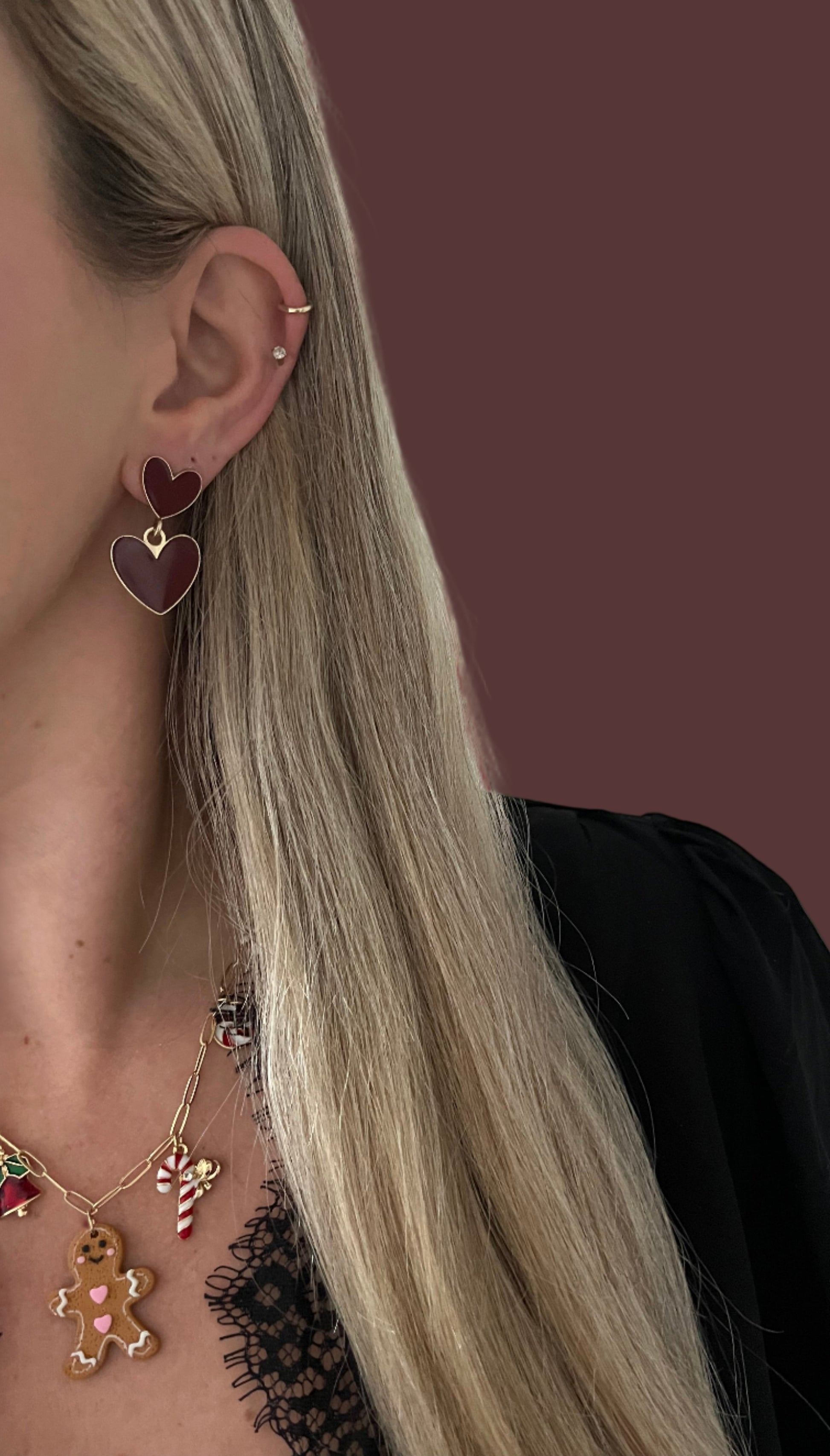 Deze elegante hart oorbellen in een diepe wijnrode kleur zijn een echte eyecatcher. Het dubbele hartdesign een kleiner hartje bovenaan en een groter hangend hart eronder creëert een speels maar chic effect. De warme wijnrode tint, omlijst met een subtiel gouden randje, geeft de oorbellen een luxe uitstraling die perfect past bij zowel winterse outfits als feestdagenlooks.