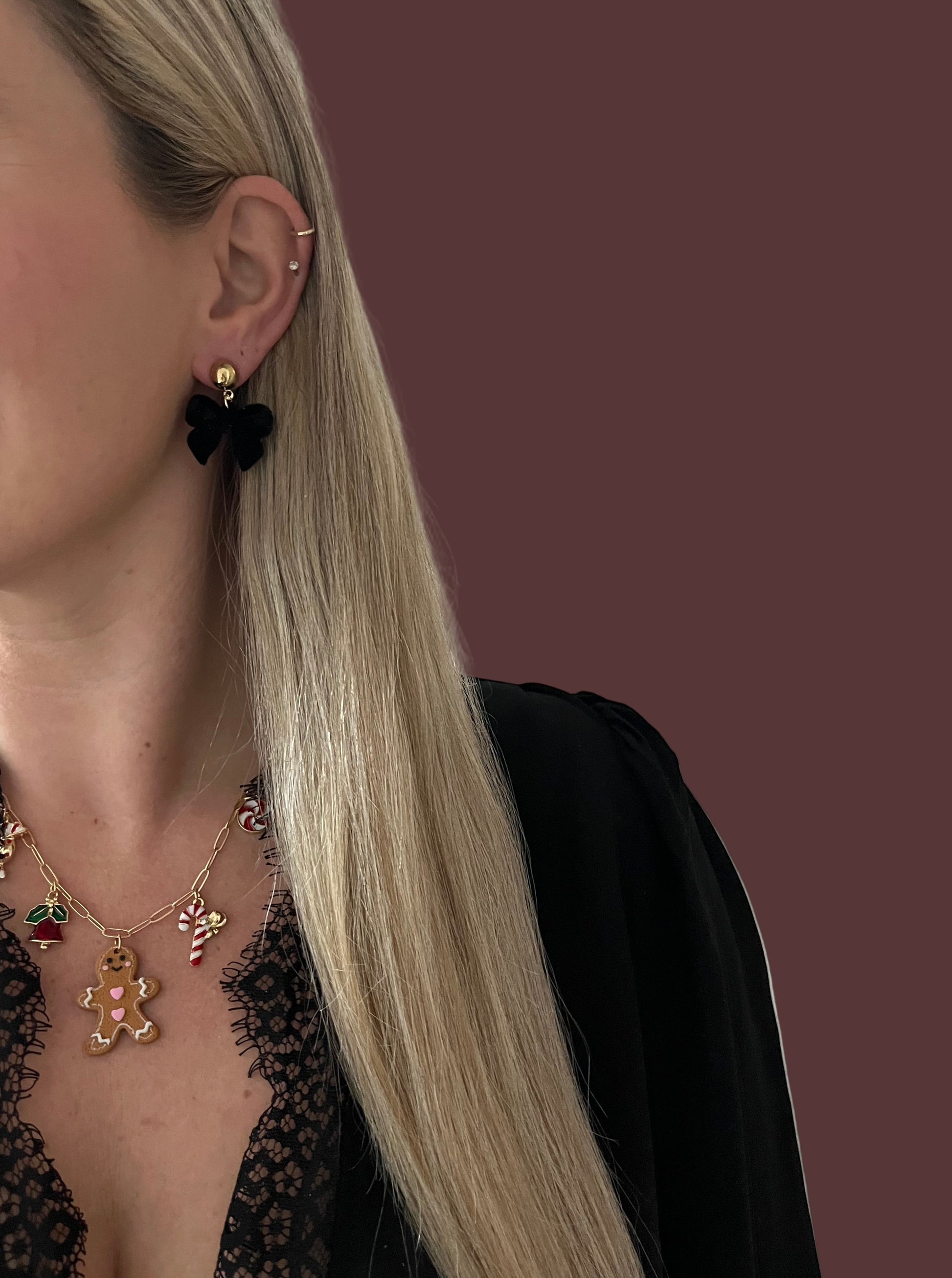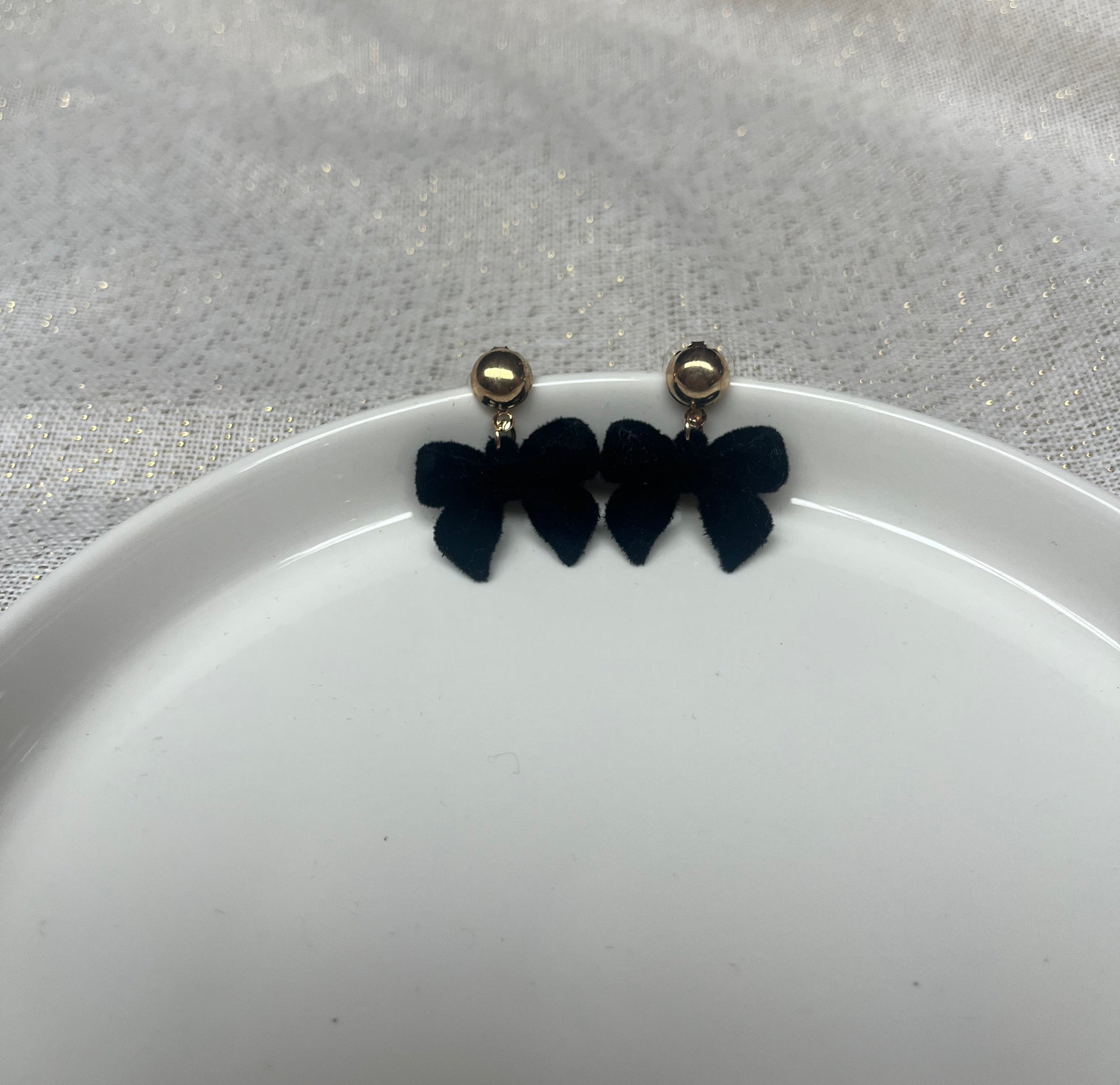 Deze zwarte velours strik oorbellen combineren elegantie met een zachte, luxueuze uitstraling. De zwarte velvet stof geeft de oorbellen een stijlvolle en tijdloze look, terwijl het subtiele gouden stekertje zorgt voor een mooie balans tussen klassiek en trendy. Ideaal voor zowel feestelijke gelegenheden als een sophisticated everyday look.